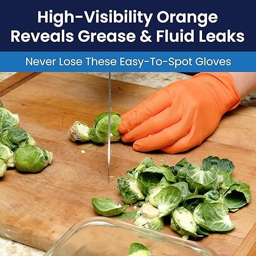 - High Visibility Disposable Gloves: The vibrant orange color of these disposable nitrile gloves increases hand visibility at the workplace to help enhance safety
