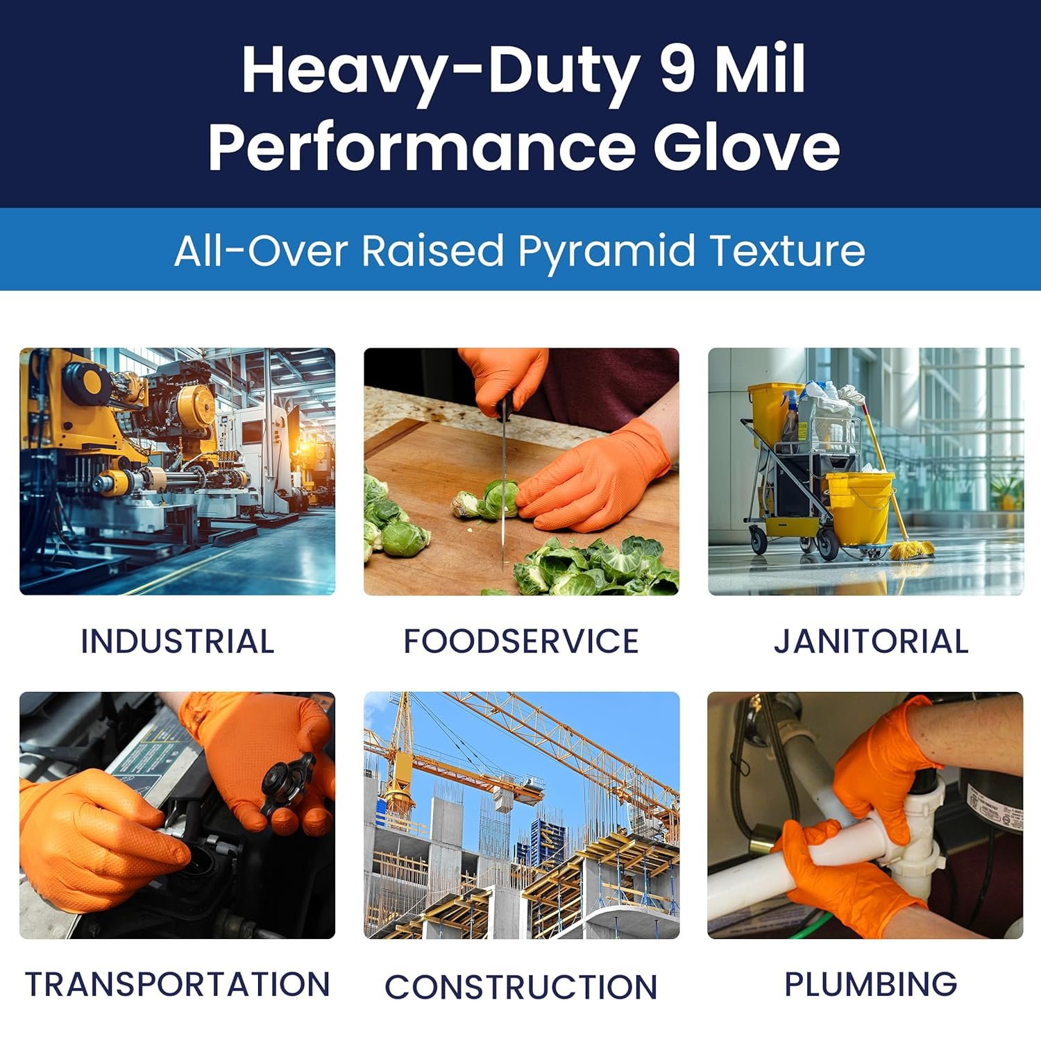 - Thick and Durable Non-Latex Gloves: These disposable work gloves are made of 9 mil nitrile designed with a high raised Pyramid Grip for heavy-duty applications and provide extra protection and stronger resistance to wear and tear