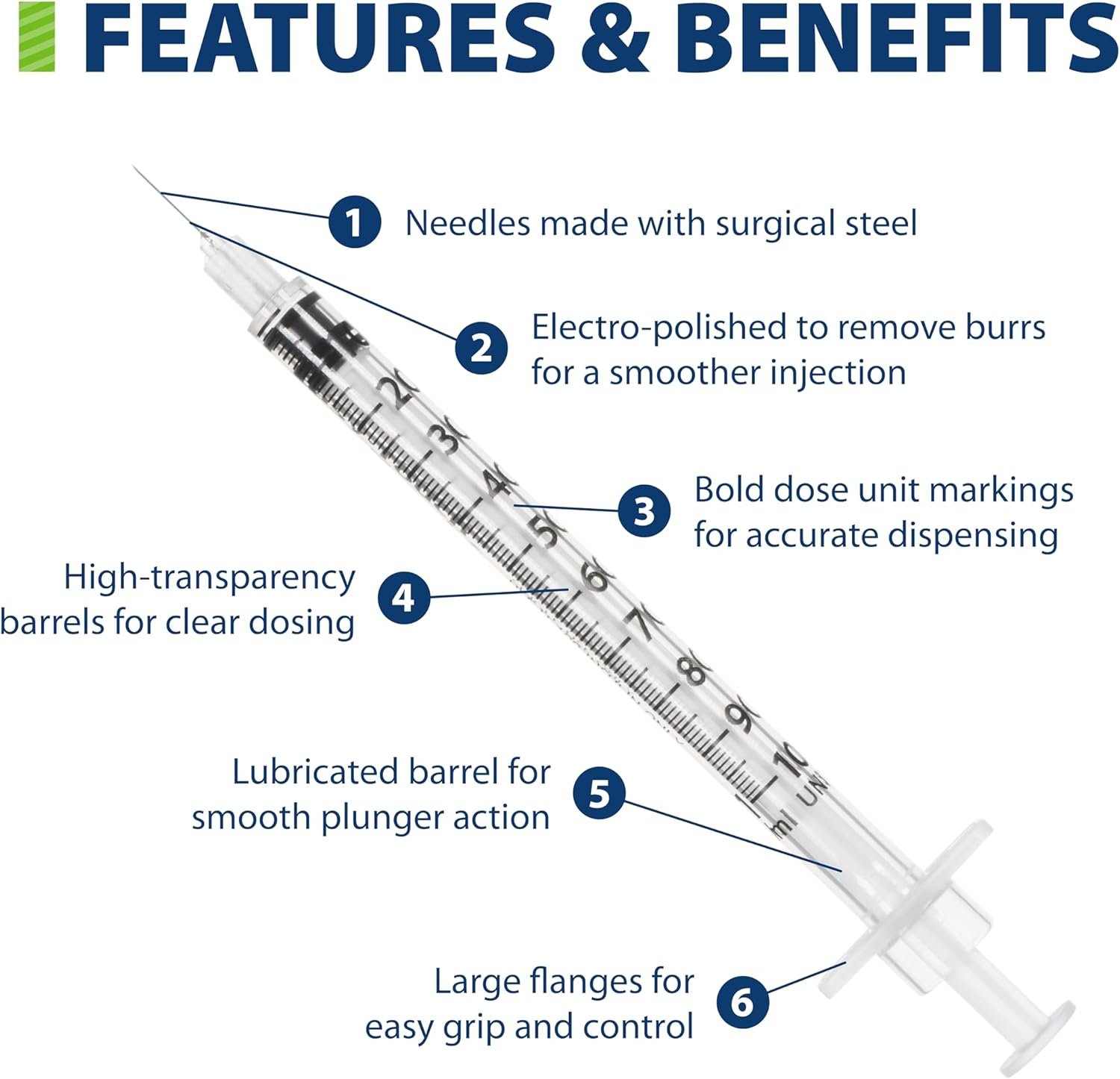Crafted with a 1/2” long needle, these syringes ensure a gentle yet effective injection experience. Engineered for single-use, they uphold high hygiene standards, making them ideal for safe and sterile insulin management. With its ultra-thin 29 gauge needle, users can depend on reduced discomfort during each use.